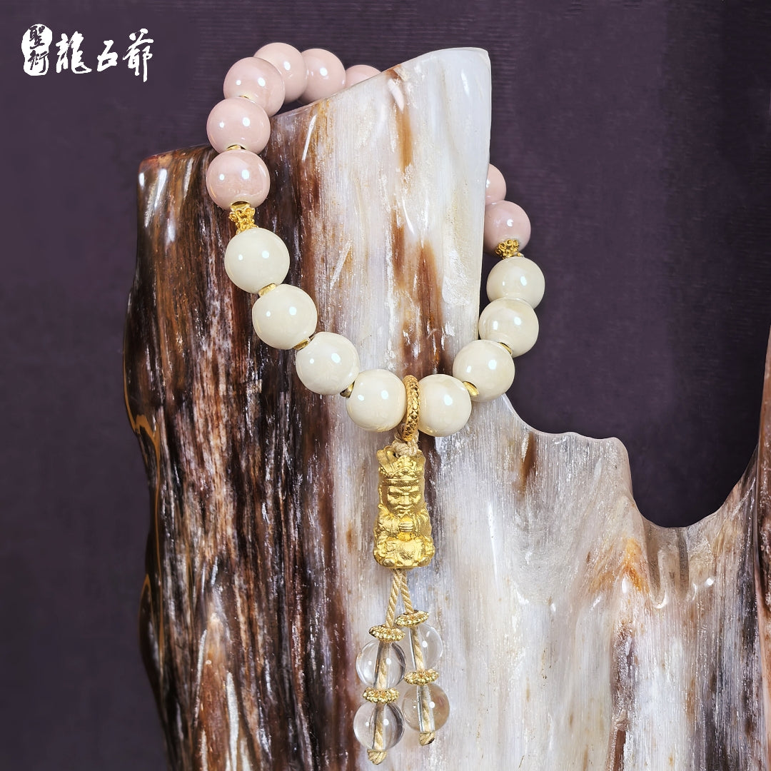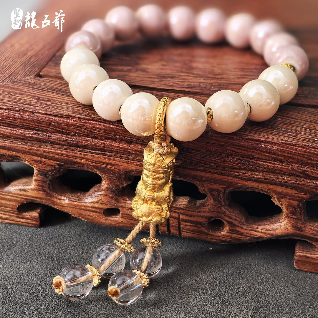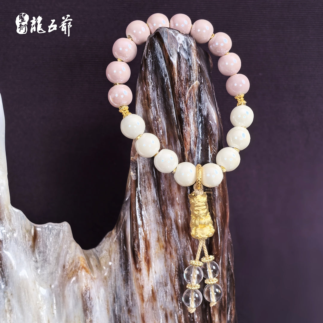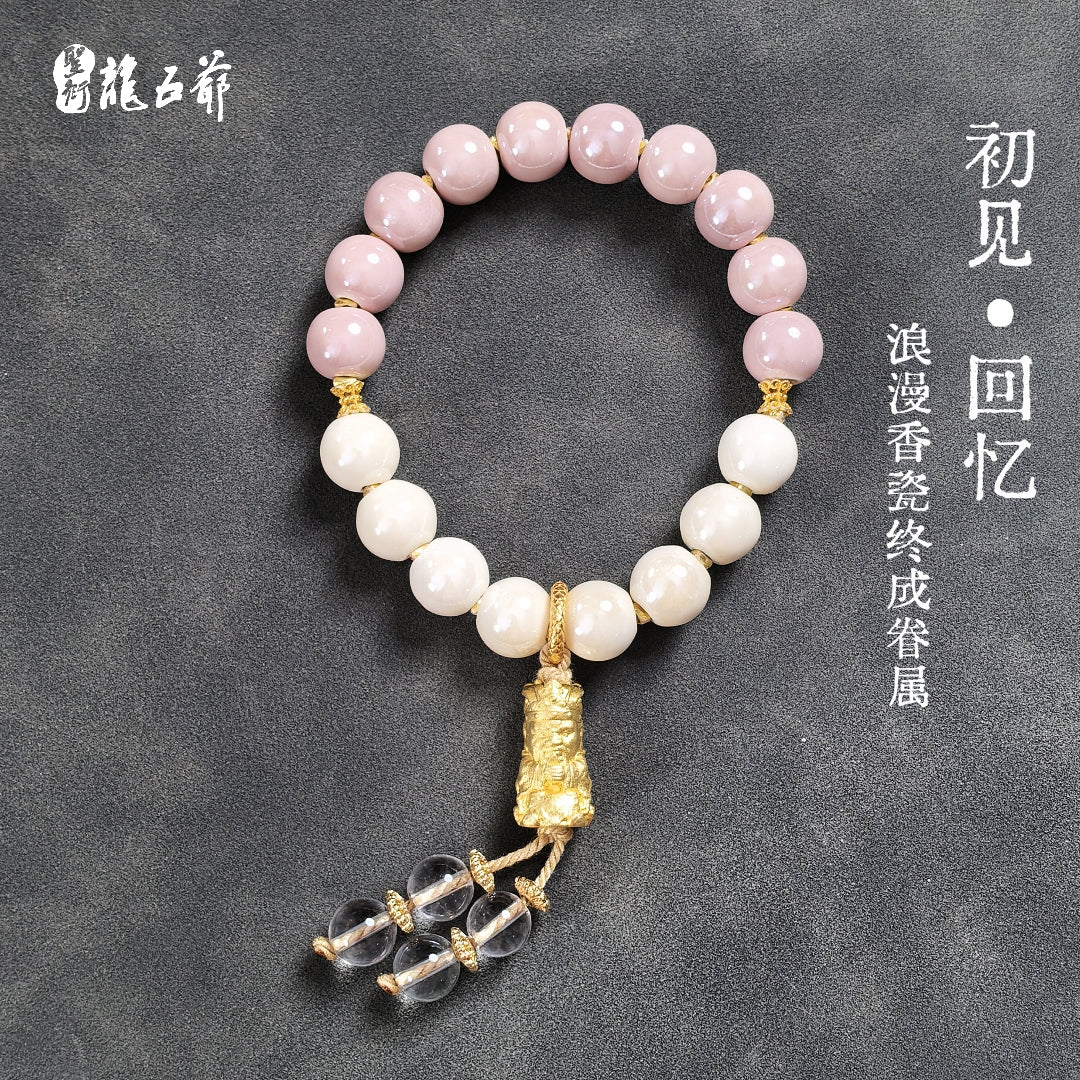 White incense ash porcelain represents purity and elegance, symbolizing the beginning and the "first encounter" in the name of this bracelet. Lotus root pink porcelain represents romance and beauty. This color always evokes memories of carefree times, hence the name "Memories" for this lotus root pink porcelain piece. This bracelet's combination expresses the sentiment of cherishing the present, remembering beautiful moments, and embracing a brighter future. May you move forward, achieve your goals, and find your happy ending.